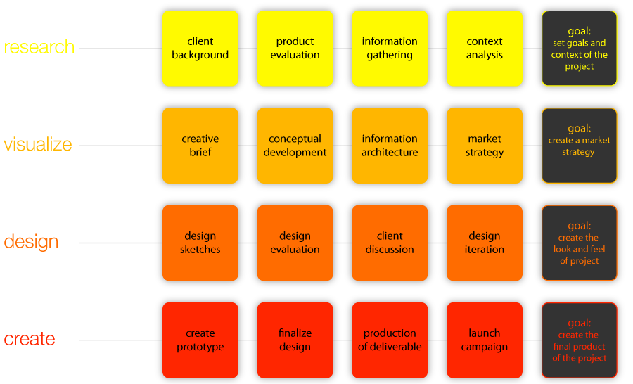 Production phase. Designs created in final format for print production and / or media outputs, online integration or media presentation as needed. Production and delivery of deliverables.